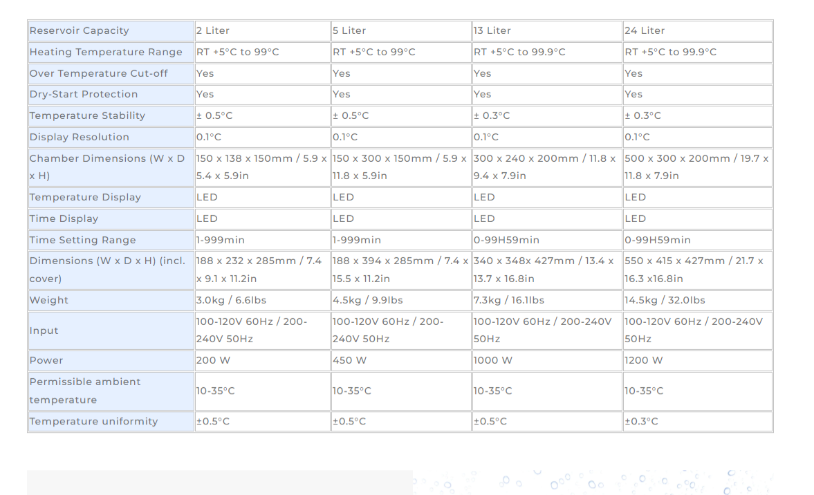 Water Baths: User-friendly LED display, adjustable temperature, precise control, touch interface, dry-start protection. Over-temperature cut-off & alarm, programmable modes, stainless-steel chamber, timed operation, and easy unit switch (°F/°C).