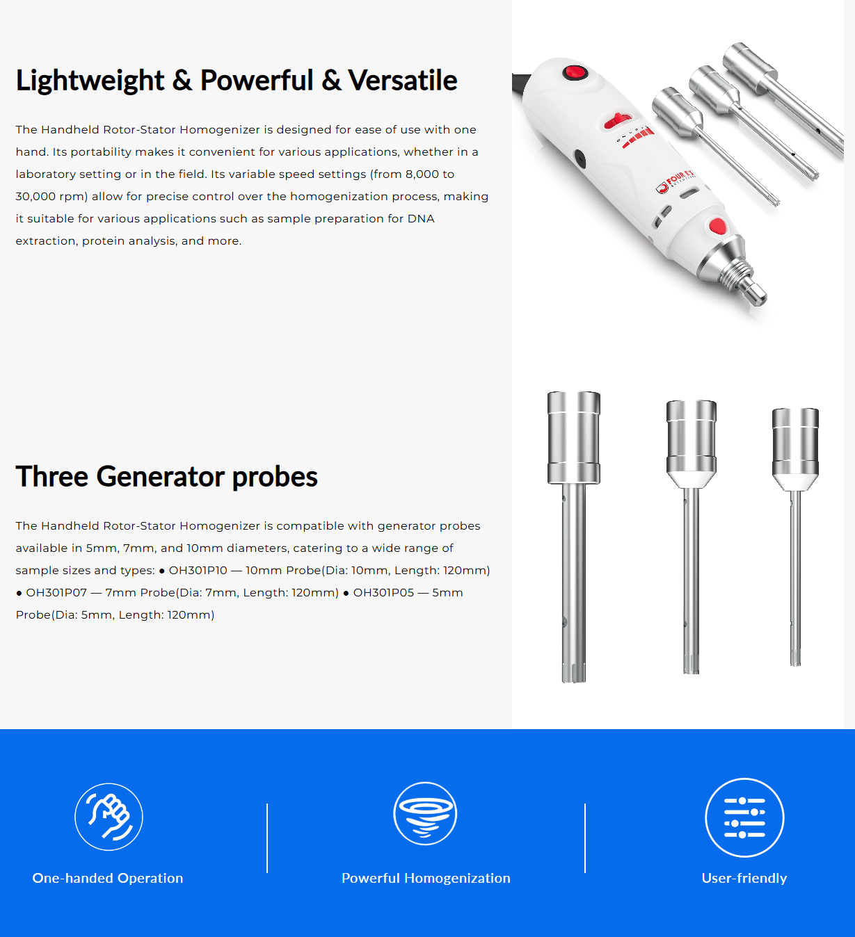 The OH301 Handheld Rotor-Stator Homogenizer can rapidly homogenize biological samples and handle sample volumes ranging from 0.1ml to 250ml, depending on the generator probe used. The rotor rotates rapidly within a stationary stator. This creates a suction effect, and the sample is drawn into the space between the two components, where it is subjected to high shear forces thereby homogenizing the samples.