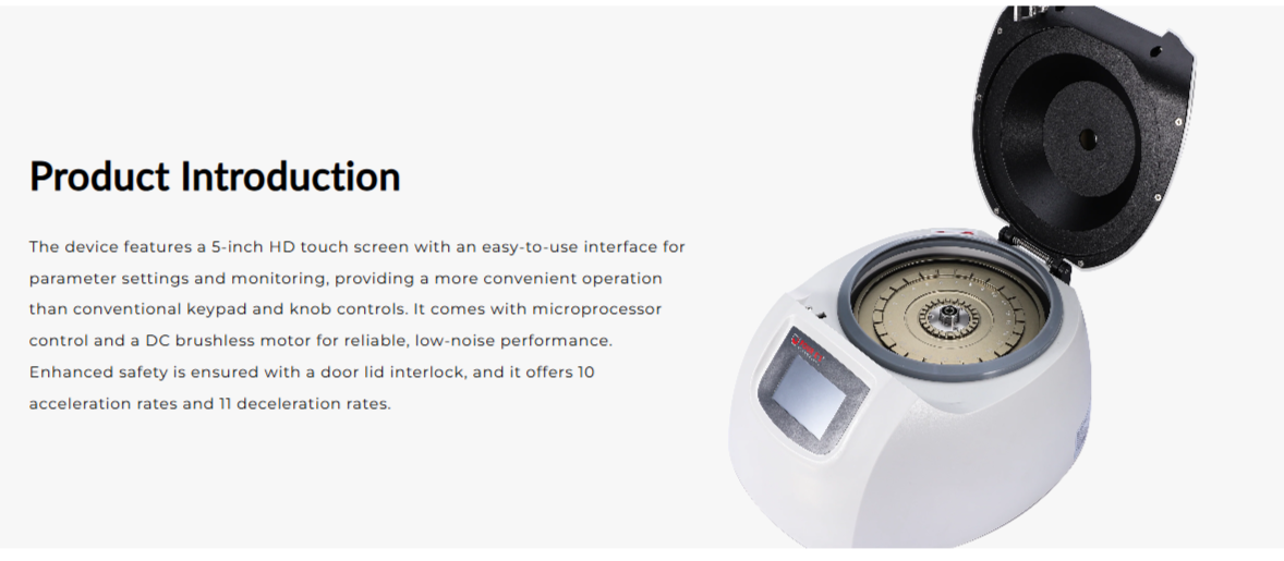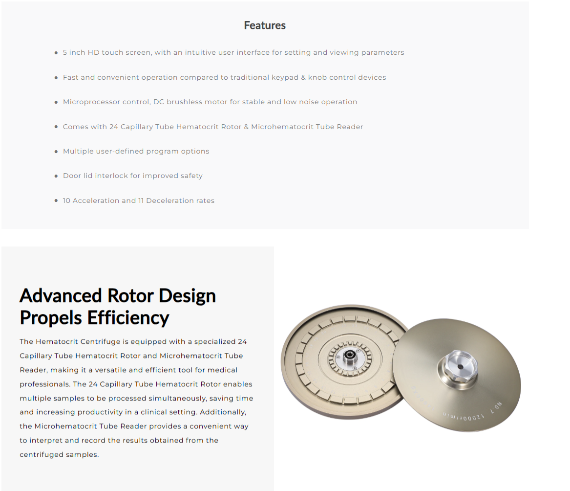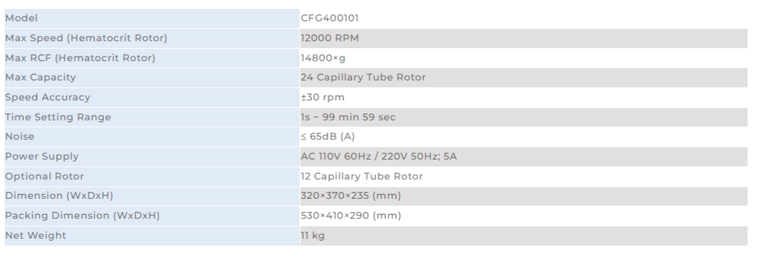 The CFG400101 Hematocrit Centrifuge with 24 Capillary Tube Rotor is used for determination of volume fractions of erythrocytes in blood for diagnostic purposes and doping tests and also for separation of micro blood and solutions. This device facilitates the photometric assessment of bilirubin levels in neonatal blood specimens. It runs at 12,000 RPM and accommodates up to 24 capillary tubes to a maximum RCF of 14,800 xg. The CFG400101 Hematocrit Centrifuge conforms to international safety standards and regulations.