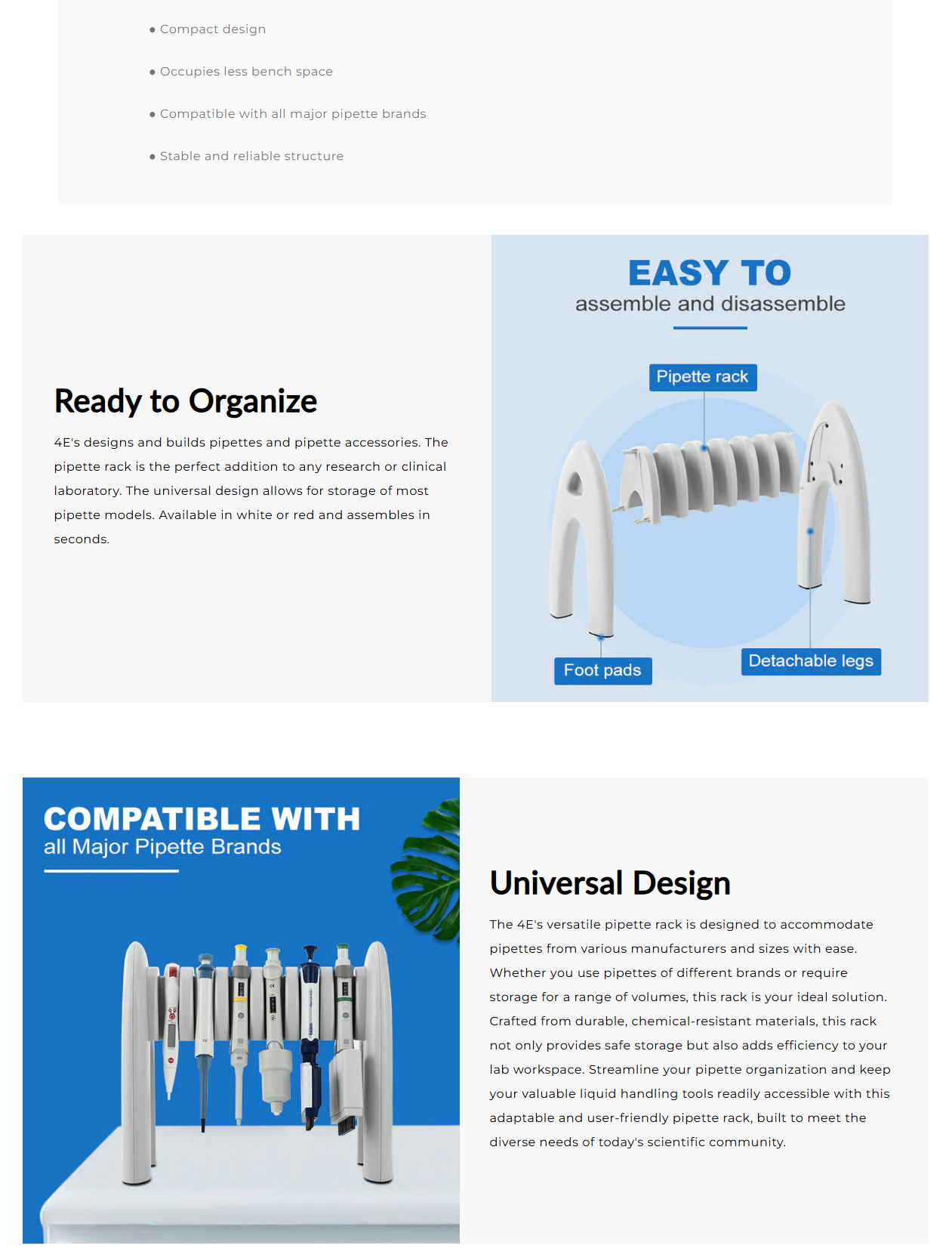 These compact racks position the pipettes so that they are easy to identify and reach. These affordable yet sleek stands will bring better organization to your liquid handling devices. The racks have six positions and are offered in two colors, white and black and red. The racks are easy to assemble and are very sturdy unlike may flimsy plastic pipette racks. Contact a product specialist if you have any questions regarding our racks or pipettes.